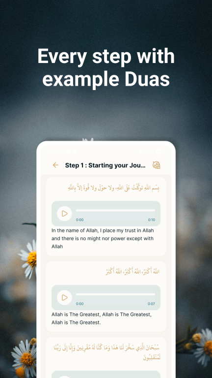 - Voice Transcription: Immerse yourself in the spirituality of Umrah with voice/audio transcriptions of all the provided duas. Listen and follow along as you perform each ritual, fostering a deeper connection with your faith.